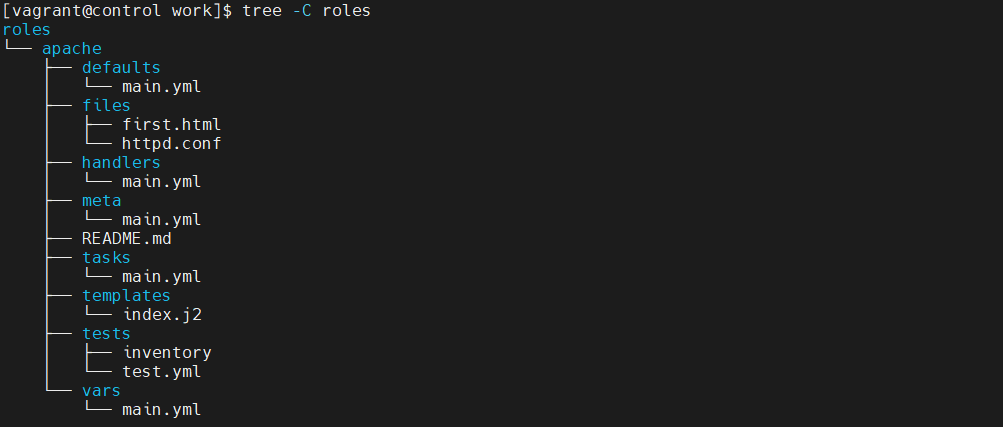 [vagrant@control roles]$ mkdir tasks meta handlers vars test default