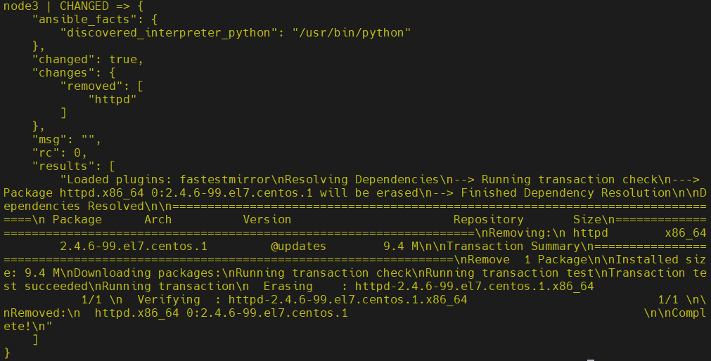ansible centos -m yum -a 'name=httpd state=absent' --become