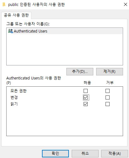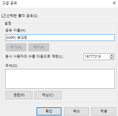 ▷ 고급 공유에서 이름 뒤에 $ 를 붙이면 숨김으로 설정 된다