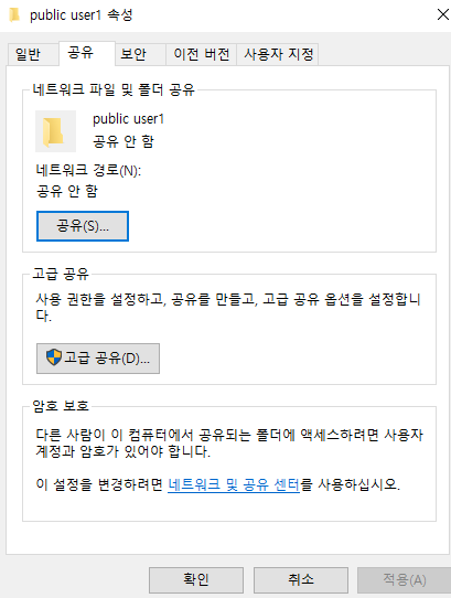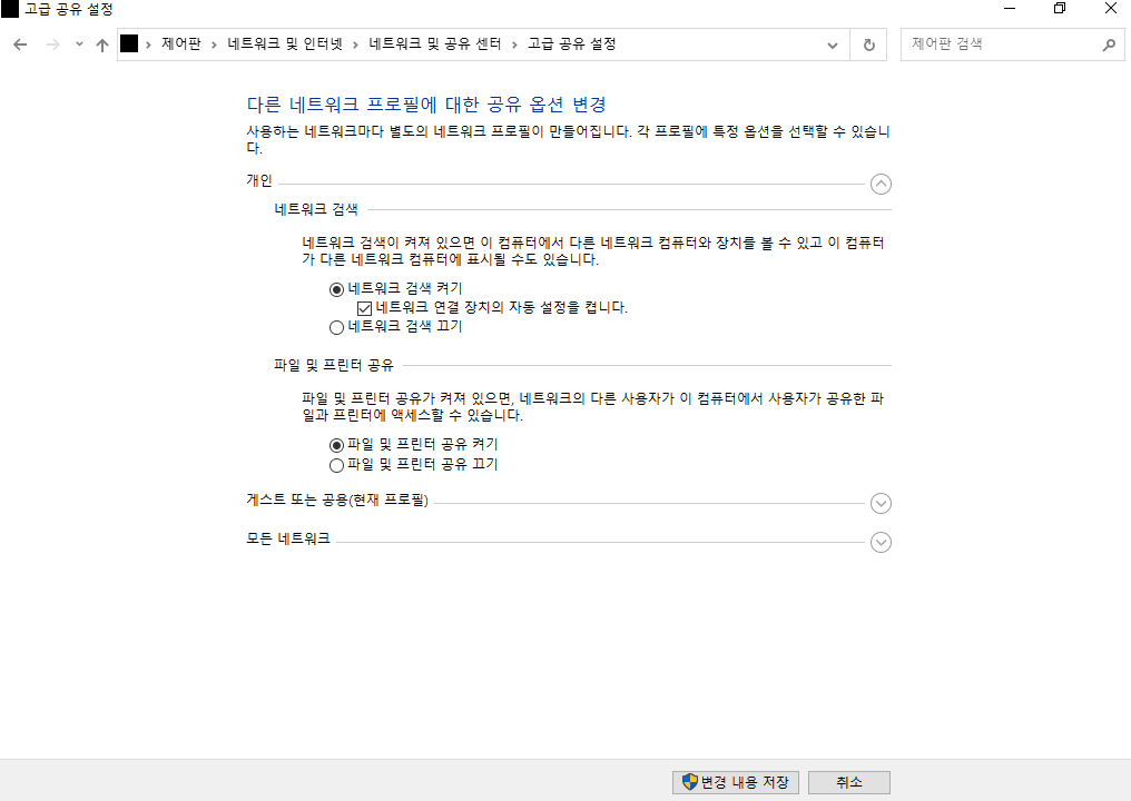 ▶ 제어판 >> 네트워크 및 인터넷 >> 네트워크 및 공유 센터 >> 고급 공유설정