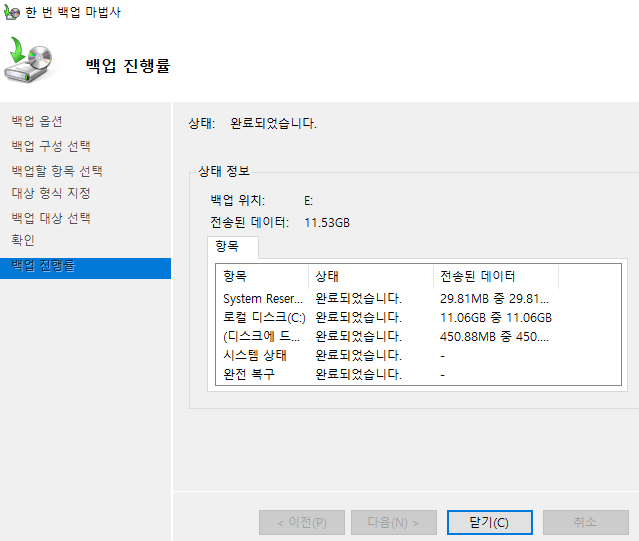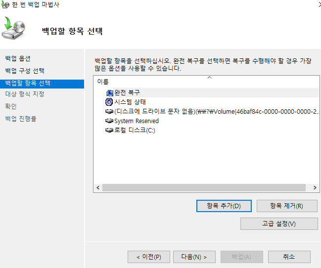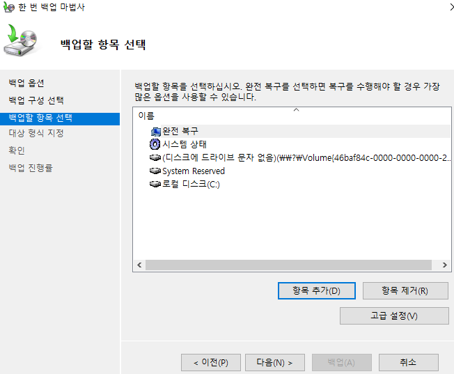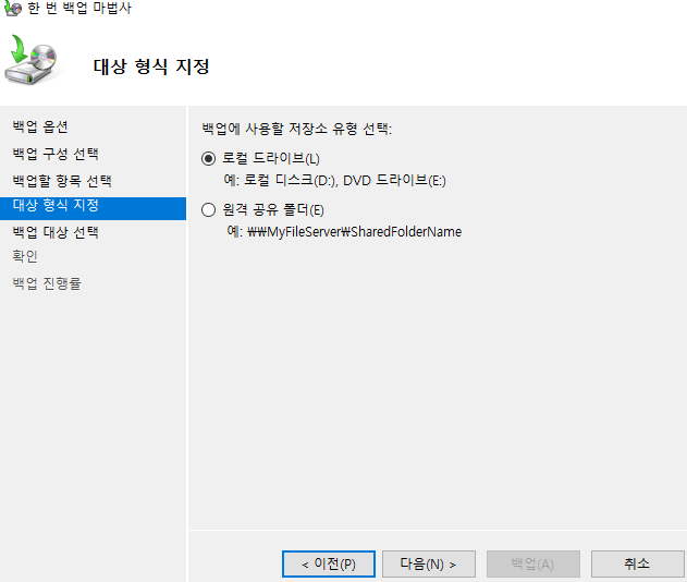 >> 백업전용(E:) 드라이브에 전체 백업을 할 예정이므로 로컬 드라이브를 선택한다