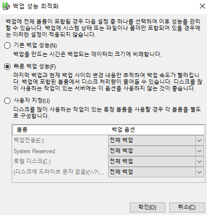 >> 성능 설정 구성 >> 빠른 백업 성능으로 지정