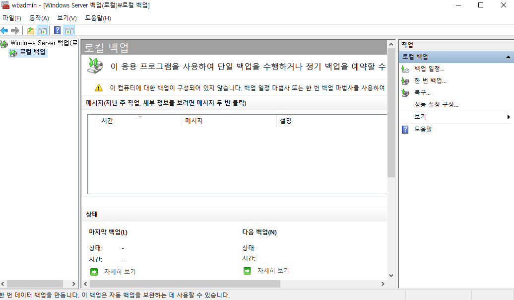 [ 컴퓨터 관리 ] >> [ 저장소 ] >> [ Windows Server 백업 ]