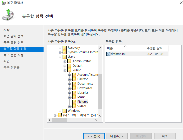 ▷ 복구 유형을 볼륨으로 선택하면 C드라이브 전체가 복구된다