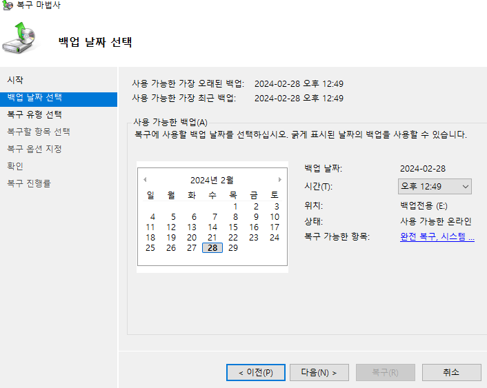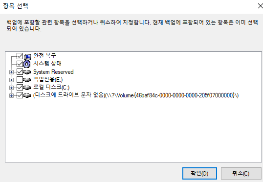 ▷ 완전 복구를 선택하면 백업전용 E: 드라이브 빼고 선택된다