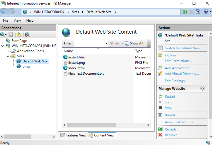 ▶ http://192.168.95.10/ 접속했을 때 특별히 다른 웹 페이지를 저장하지 않으면 iisstart.htm 파일이 열리게 설정되어있음을 확인할 수 있다