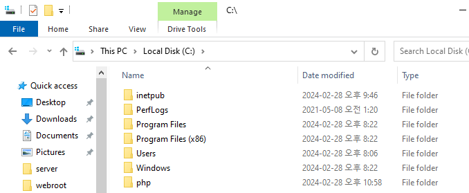 ▶ 압축을 풀고 php 폴더로 만든 후, C 드라이브 바로 밑으로 이동