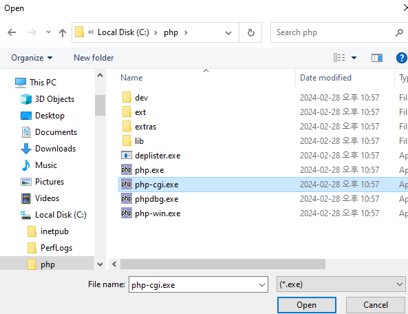 >> php-cgi.exe 가 없으면 *.exe 로 변환하면 보인다