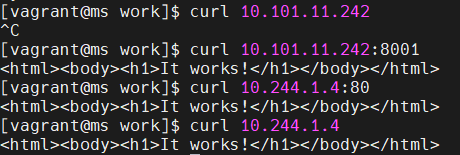 ▷ ClusterIP 는 ms 와 wk1 , 2 가 하나로 묶어서 쓰는 IP 를 의미한다 ( 컴퓨터 3대가 묶여있는 IP )