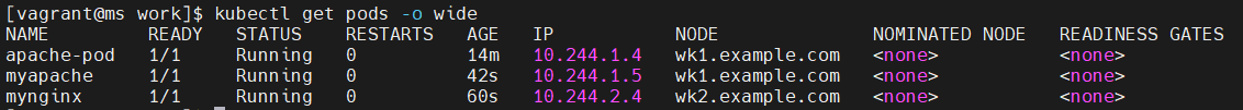 apache-pod 1/1 Running 0 2m35s 10.244.1.3 wk1.example.com <none> <none>