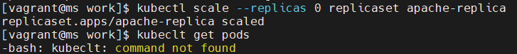 [vagrant@ms work]$ kubectl scale --replicas 0 replicaset apache-replica