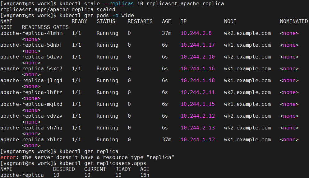[vagrant@ms work]$ kubectl scale --replicas 10 replicaset apache-replica
