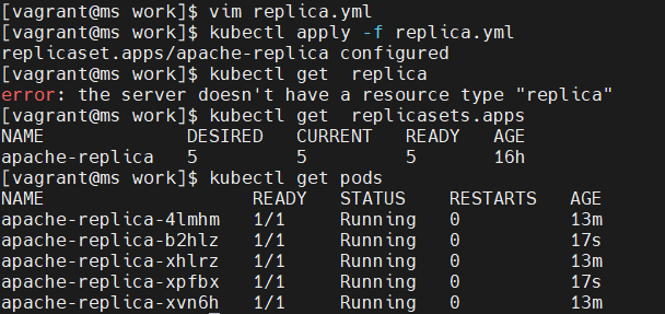 [vagrant@ms work]$ kubectl apply -f replica.yml