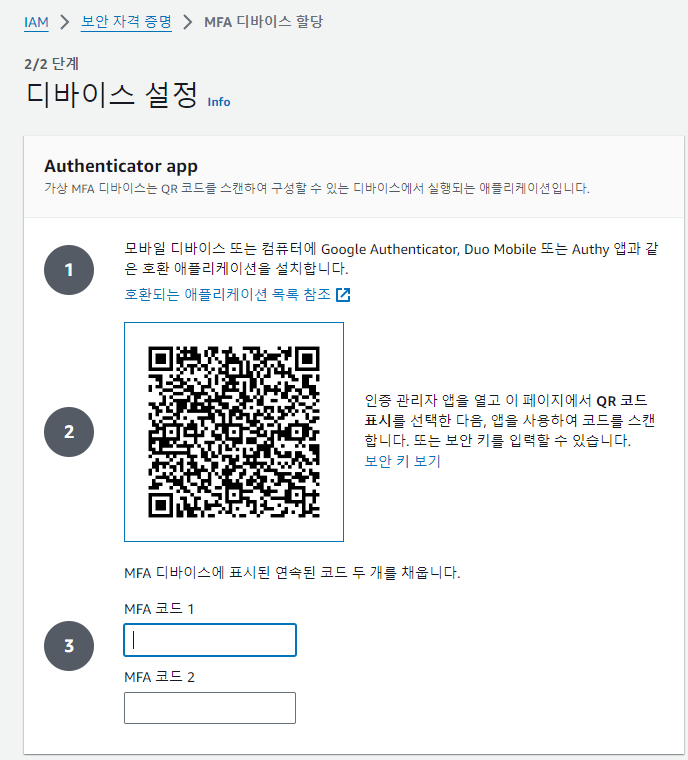 >> 핸드폰에서 다운로드 하여 MFA 코드 2번 입력