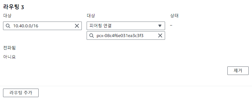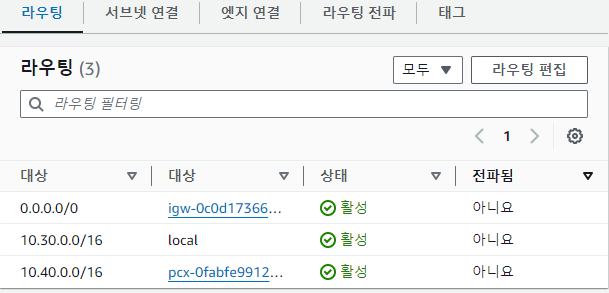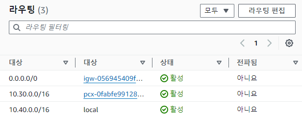 >> 한쪽만 피어링 연결 후에 각 리전에서 라우팅 태이블 추가하면 된다