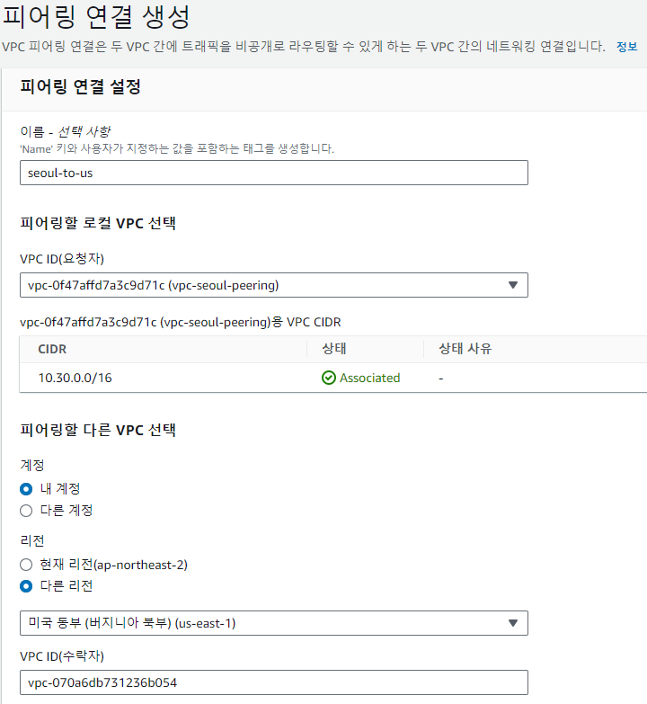 >> 서울과 버지니아 양쪽에서 피어링 연결 생성해야 한다 ( 양방향 )