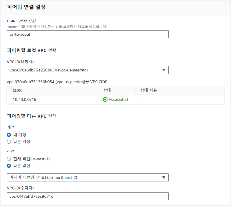 ○ 버지니아에서 서울 리전으로 피어링 연결 요청