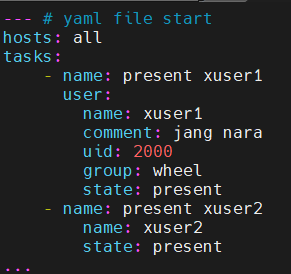 ▶ hosts 와 tasks 는 깊이가 같아서 들여쓰기 X